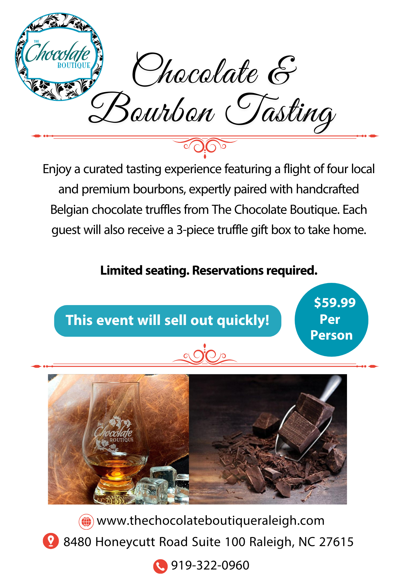 Indulge in an elevated bourbon and chocolate tasting. Enjoy a curated flight of four local and premium bourbons, expertly paired with handcrafted Belgian chocolate truffles from The Chocolate Boutique. Guests will take part in a guided tasting experience and leave with a 3-piece truffle gift box. Limited seating—reservations required.